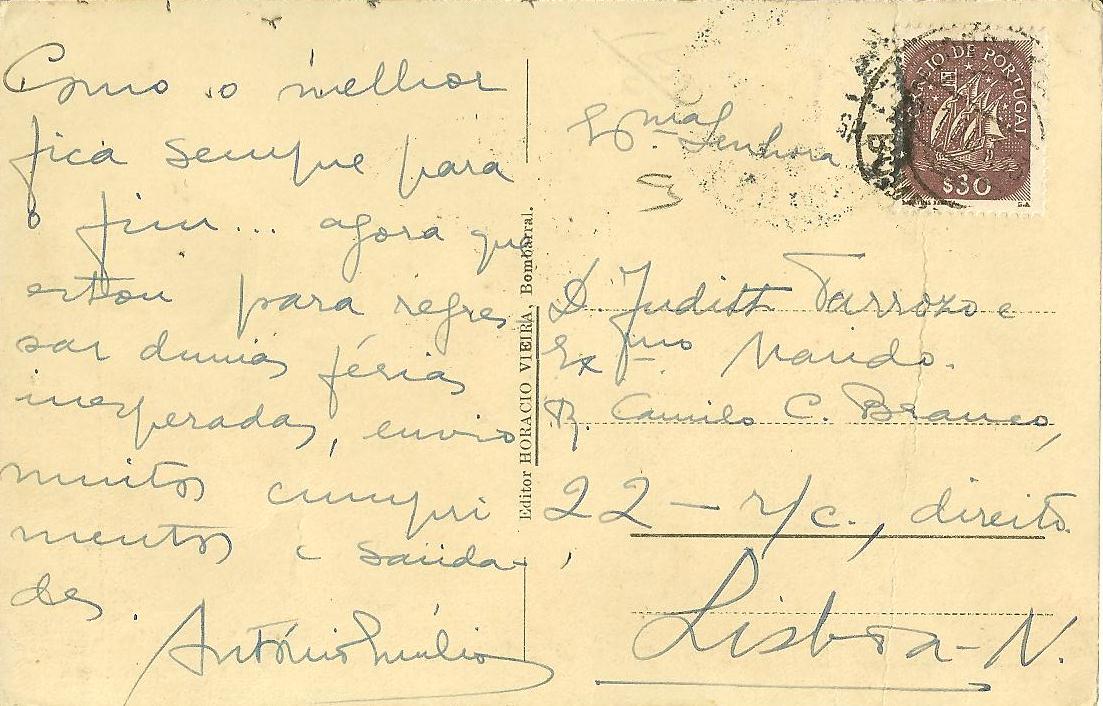 Postal que reúne as quatro imagens de outros tantos postais da coleção. No centro, o brazão do concelho e uvas a simbolizar uma terra de vinhos.